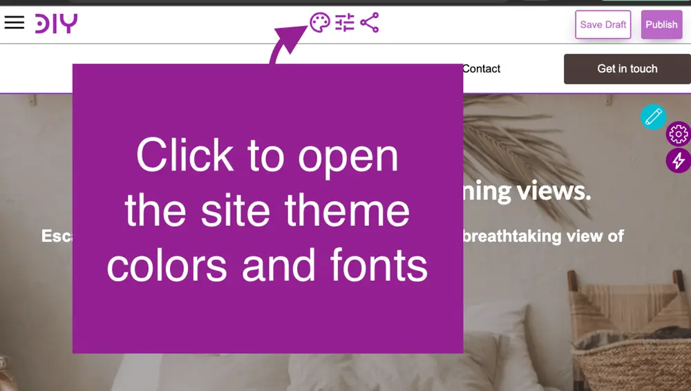 Logging into your website opens the homepage in edit mode. In the top center, you'll see menu icon buttons. Click on the color palette icon, and an additional screen featuring theme colors and fonts will appear for your customization.
